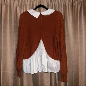 Elegant burnt orange sweater featuring a crisp white collar. Perfect for stylish layering.