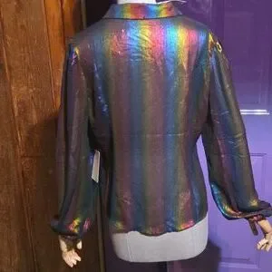 brand new with tags sheer rainbow color button up. metallic/shiny rainbow stripes. elastic sleeves give super cute puffy detail. size M.