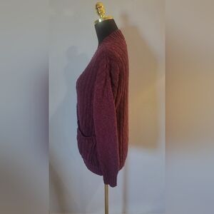 Burgundy SO cardigan with tortoiseshell button closure. Features a cozy ribbed design and front pockets. Perfect for layering!
