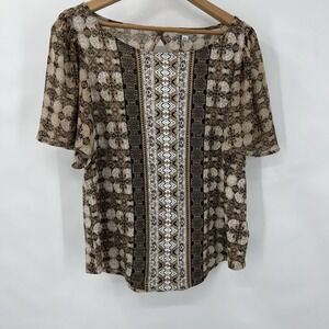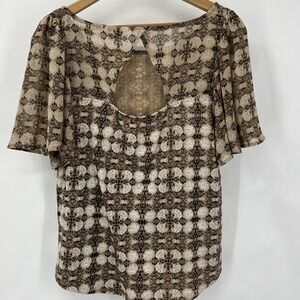 Lucky Brand Shirt Womens Med Brown Aztec Geometric Pattern Flutter Sleeve Tribal