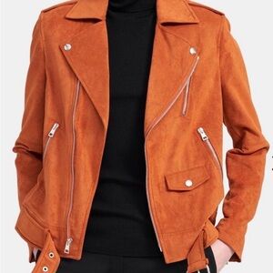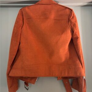 Chic orange suede jacket by Theory. Features stylish zippers and a sleek design. Perfect for a modern look.