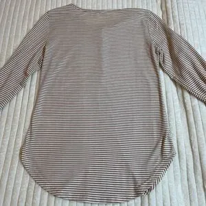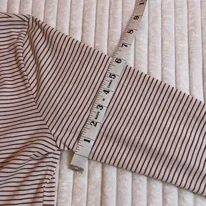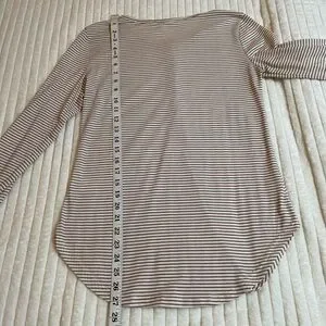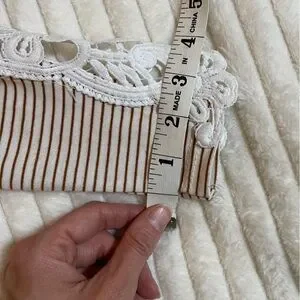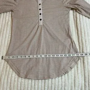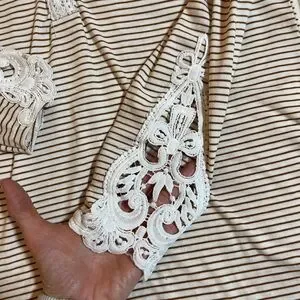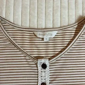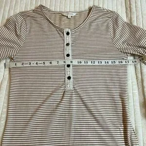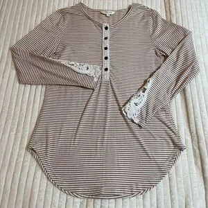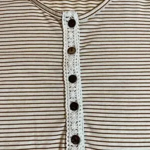 Enhance your wardrobe with this stylish striped top. Featuring a delicate lace detail, and cute button front details, this cream and golden brown top is perfect for any casual outing. Pair with your favorite jean skirt or layer under a quilted vest. The lace cuffs are darling and would look so adorable peeking out from under the cuffs of a sweater. The options are endless and it’s such a sweet and girly piece. See all pics before purchase to be certain of the details, condition and measurements. Thanks for looking!!