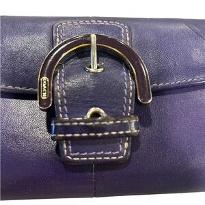 Classic and timeless Coach leather wallet crafted in a rich deep navy/indigo tone. This wallet features a sleek envelope-style silhouette with a distinctive silver-tone buckle accent and contrast stitching for an elevated, polished look. Made from smooth, durable leather that softens beautifully with wear.