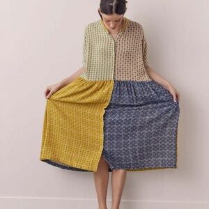 Amente's 100% cotton contrast midi dress levels up their already-strong contrast plaid game with a new palette and lighter weight fabrication.
