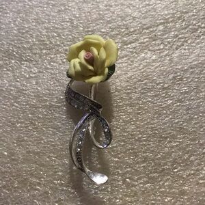 This elegant brooch features a delicate yellow rose with a shimmering silver swirl design. Perfect for adding a touch of sophistication to any outfit.Avon long 2.5”