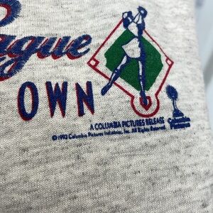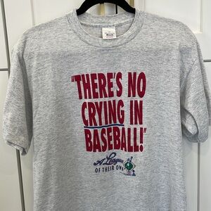 Vintage 1992 A League of Their Own movie grey promo T- shirt with large red print “THERE’S NO CRYING IN BASEBALL” and movie title graphic. 1992 Columbia pictures stamp. Single stitch Murinas Best 50% cotton/50% polyester fabric. Made in USA. Size tag says XL but this is a vintage tee so please pay attention to measurements provided below. Very good vintage pre owned condition Please see photos, measurements are for reference only. Reasonable offers welcome!