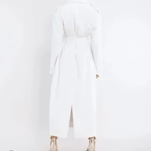 - Details: Relaxed fit, waist-tie belt, shoulder epaulets and built-in shoulder pads