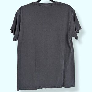 This t-shirt (by Delta Pro Weight) is made of 100% cotton and is black with short sleeves. The front of the shirt features a greyscale graphic of a skull with a bandana design around it. The shirt has wear, including some fading of the black dye in the fabric and some fuzzies around the neck, but is still very wearable.