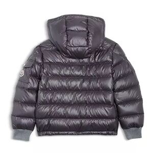 Stylish Moncler puffer jacket for kids. Shiny gray finish. Hooded design with front pockets. Perfect for cold weather.