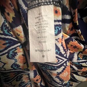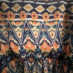 This vibrant sundress features a playful ruffled hem and a flattering ruched waistline, perfect for casual outings or resort wear. The sleeveless design with spaghetti straps and a V-neckline adds a touch of elegance, while the lightweight fabric ensures comfort in warm weather. The geometric and tribal-inspired prints in orange and blue make it a standout piece for any casual occasion.