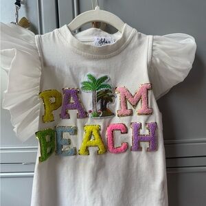 White tee with colorful 'Palm Beach' embroidery. Features puff sleeves. Fun and vibrant design.