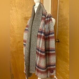 Chic plaid scarf with red and blue tones. Features a stylish houndstooth pattern. Perfect for any outfit. There is a spot where I think it’s just how that fabric was sewn as pictured.