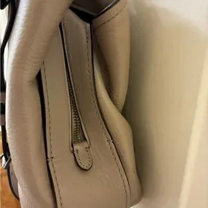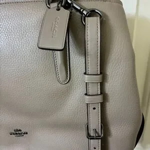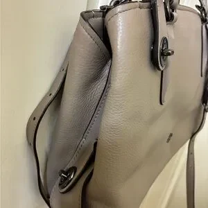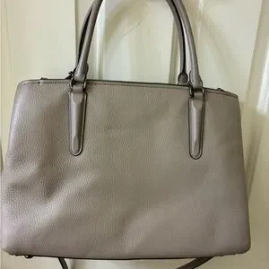 This is a Coach Brooklyn Carryall size 34, crafted from natural grain leather. This style is a versatile satchel designed for both shoulder or crossbody wear with its detachable strap and top handles.ย