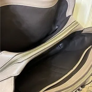 * Hardware: The bag uses quality, solid hardware, nickel, for its zippers, rings, and turn-lock details.