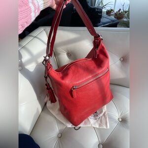 This style is a nod to one of Coach's most coveted styles, the 9085 Duffle Sac. It’s cool, slouchy hobo style bag. The exterior is made of smooth warm-toned fiery coral / red orange leather, with silver-tone hardware and silver Coach logo embossed on the front. Top-zip closure with leather zipper pull.