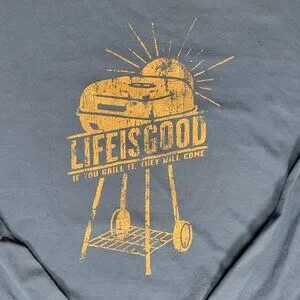 - Lettering: "LIFE IS GOOD" and "IF YOU GRILL IT, THEY WILL COME"