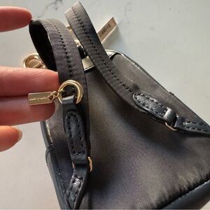 Navy and floral with gold hardware bag charm, key fob. Still has tag and baby hangtag attached. Can fit quite a bit, including AirPods.