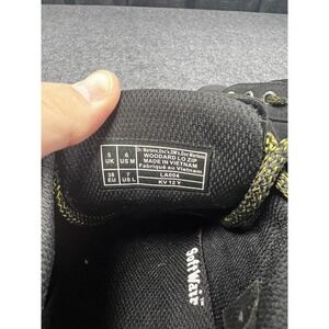 Color: Black leather upper with tonal black panels, black mesh collar, yellow contrast stitching, and black and yellow rope laces.