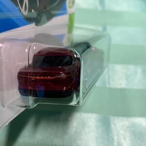 Hot Wheels die-cast car in a sleek red design. Features an electric vehicle model.
