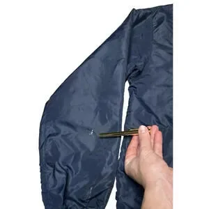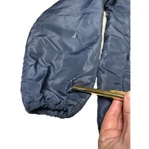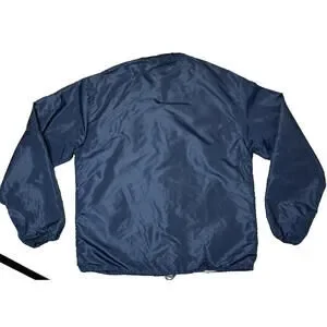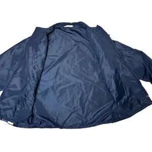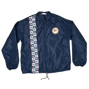 This Vintage 60s 70s Horizon Sportswear Chevrolet Corvette Racing Windbreaker is a lightweight men's jacket in size L, with a chest size of 44 inches and a sleeve length of 23.5 inches. The windbreaker features a retro design from the 1970s, with a blue color and nylon material. Made in the United States by Chevrolet, this original windbreaker exudes a classic look with a shoulder to shoulder measurement of 18 inches and a shoulder to hem length of 26 inches. Perfect for casual occasions, this vintage piece is a stylish and nostalgic addition to any wardrobe. Gently worn and in good overall condition. There are a couple white marks on the left sleeve and a couple small pulls, pictured. No holes or stains. Smoke-free, pet-free home.