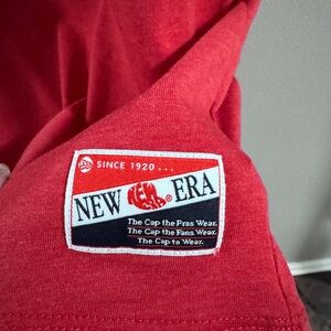 Stylish New Era t-shirt. Features red body with blue collar. Comfortable and trendy.