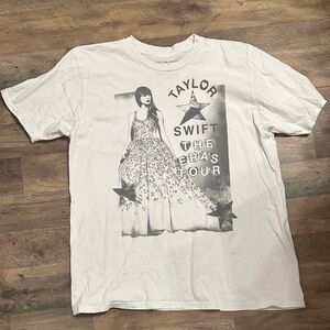 BEIGE OVERSIZED T-SHIRT FEATURING PHOTO OF TAYLOR SWIFT, STAR DESIGN, AND "TAYLOR SWIFT | THE ERAS TOUR" PRINTED ON FRONT WITH "TAYLOR SWIFT | THE ERAS TOUR", TOUR LOCATIONS, AND HEART DESIGN PRINTED ON BACK.