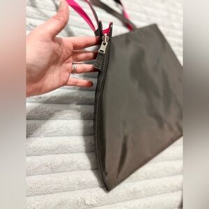 Chic, lightweight Ann Taylor LOFT tote featuring a sleek brown exterior with a bold hot pink interior for a fun pop of color. This zip-top tote is perfect for everyday use—work, travel, errands, or gym days. Spacious interior fits essentials with ease, while the sturdy double handles offer comfortable shoulder carry. Clean, minimalist exterior with signature LOFT quality construction.