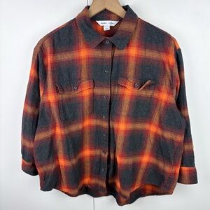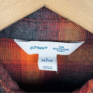 Old Navy brand the boyfriend shirt button down cotton flannel top. Fire campfire orange red and charcoal gray black plaid pattern. Extremely close to the coat that Taylor Swift wears on the cover of her album Evermore. Perfect to wear for the The Eras Tour Movie or concert or for fall autumn. Super soft breathable and comfortable.
