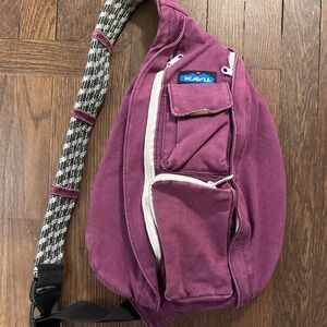 Kavu sling bag in vibrant magenta. Features multiple compartments and a patterned strap.