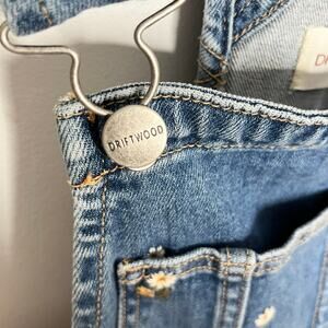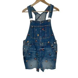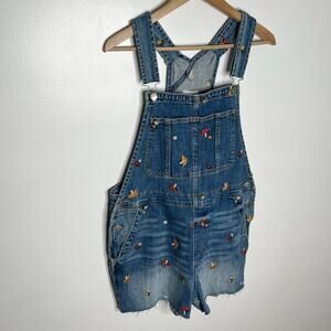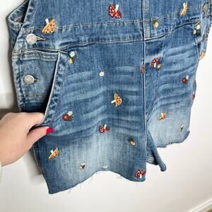 Driftwood Embroidered Denim Shortalls Womens Medium Blue Mushroom Print
