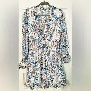 Floral Deep V Neck Open Back Ruffle Dress in Blue and Orange Large