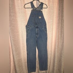 Stylish blue denim overalls by Levi's. Features adjustable straps and front pocket. Ideal for casual outings.