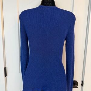 Dressy ribbed stretchy cobalt blue sweater with turquoise blue shimmering sparkle throughout! Extremely flattering design with quality zipper adorned with metal Nygaard pull tab and same branding is on bottom corner. The silver zipper is like jewellery complimenting the stunning blue: