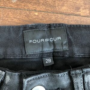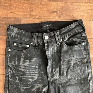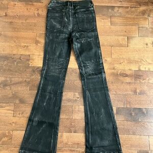 The hand waxed flared denim is crafted with comfortable stretch denim.