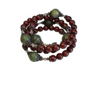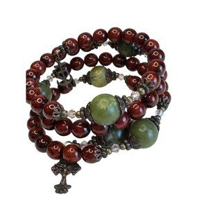 material: green Connemara marble beads; crimson red glass beads; antiqued metal charms/findings; flexible memory wire