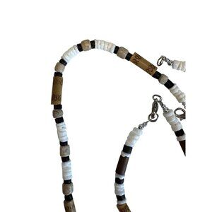 material: puka shell disc beads (white), black heishi spacers, wood/bamboo-style tube beads, stone accent beads, silver-tone clasp/hardware