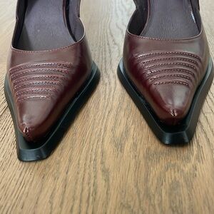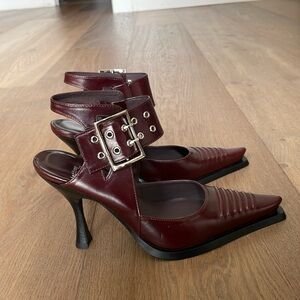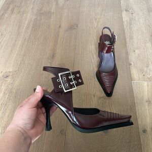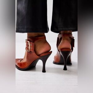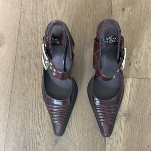 Stylish Jeffrey Campbell heels. Sleek brown leather. Elegant buckle detail. Perfect for any occasion.