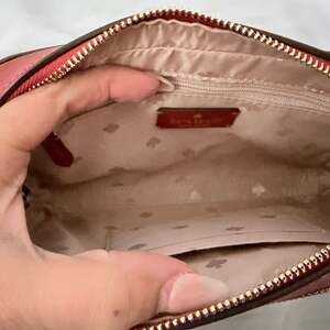 Kate Spade New York Staci Dual Zip Around Crossbody Bag in Cherrywood Saffiano Leather. Elegant and functional, this compact crossbody is perfect for hands-free days. Crafted from durable Saffiano textured leather in a rich burgundy Cherrywood hue, it features dual zip-top compartments to keep your essentials organized. The interior is lined with a signature spade jacquard fabric and includes slip pockets for cards or small items. Features light gold-toned hardware and an adjustable crossbody strap. Measures approximately 7.5 inches wide by 5 inches tall. Excellent pre-owned condition with clean interior and minimal signs of wear on the exterior leather.