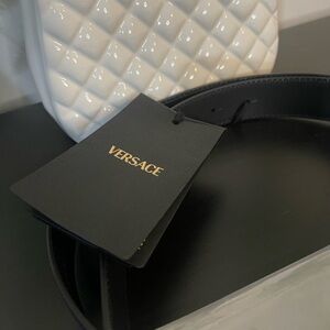 NWT Sleek cobalt blue leather belt. Features a gold Versace logo tag.