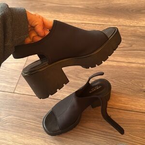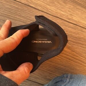 Black Vagabond platform sandals made of nylon neoprene fabric, with Velcro closing. Lug soles with 2 3/4” heels and 1 1/4” platform.
