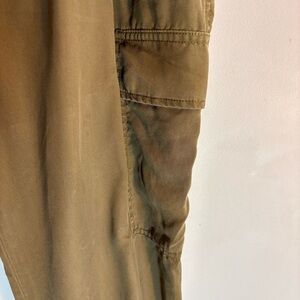 LAUREN RALPH LAUREN Sz 14 Cargo Style Slinky Fabric Olive Green Pockets Trousers. Casual elegance. Lovely drape to the fabric that moves with you. In er button mossing. Easy fix. Trendy and edgy. Pair with boots or heels or sneakers to change the look and feel. Versatile.