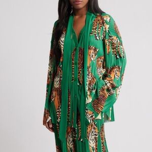 Ultrafine knife pleats and a ferocious tiger pattern emphasize the fabulously statement-making aesthetic.