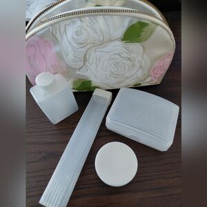 Elegant floral cosmetic bag with travel-sized containers. Vintage from the 70s Perfect for organizing beauty essentials. Plastic w/metal zipper. Small call out shown in picture.