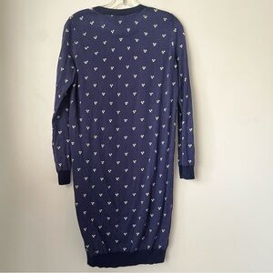 A.P.C. Rue Madam Paris Navy White Daisy Floral Sweater Dress M. 100% cotton. Long sleeve. Ribbed cuffs, hem and collar. Crew neck. Lightweight knit. Navy blue with white and yellow tiny daisy cluster print. pit to pit 21", waist is 20" across, length 36".
