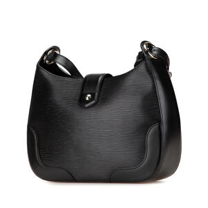 The Musette Bagatelle features an epi leather body, an adjustable flat leather strap, an open top with a strap and push lock closure, and an interior zip pocket. There is an additional hole in the shoulder strap. It carries a B condition rating.