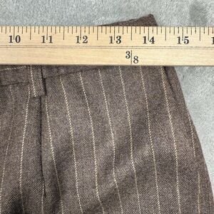 The Pendleton Women's Wool Trousers in size 8 feature a high waist design with pleated details and a pin striped pattern, adding a touch of style and sophistication to your wardrobe. Made from knit wool fabric, these dress pants are lined and offer comfort and pockets for convenience. The classic brown color makes them versatile for various occasions, from casual to formal, and their straight leg style and regular fit ensure a flattering silhouette. With a button and zipper closure, these trousers are a practical and chic addition to your collection from the renowned brand Pendleton.