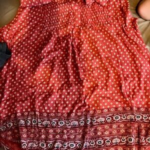 Chic coral blouse with delicate white patterns. Sleeveless and airy. Ideal for everyday style.