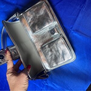 Shine with the Michael Kors shoulder bag. Metallic silver finish. With rags and paperwork. So cute!!