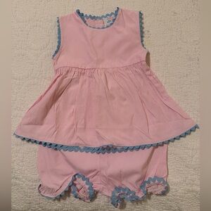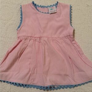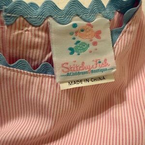 Stitchy Fish Seersucker pink with blue trim top and bottoms. Adorable pink and blue dress set perfect for your little one. Features a charming design with a comfortable fit.