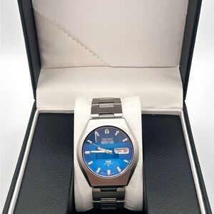 Beautiful 1975 Seiko 5 Actus SS, automatic movement, exotic blue dial, rare faceted crystal, date-day indicator, water resistant, great condition and working.